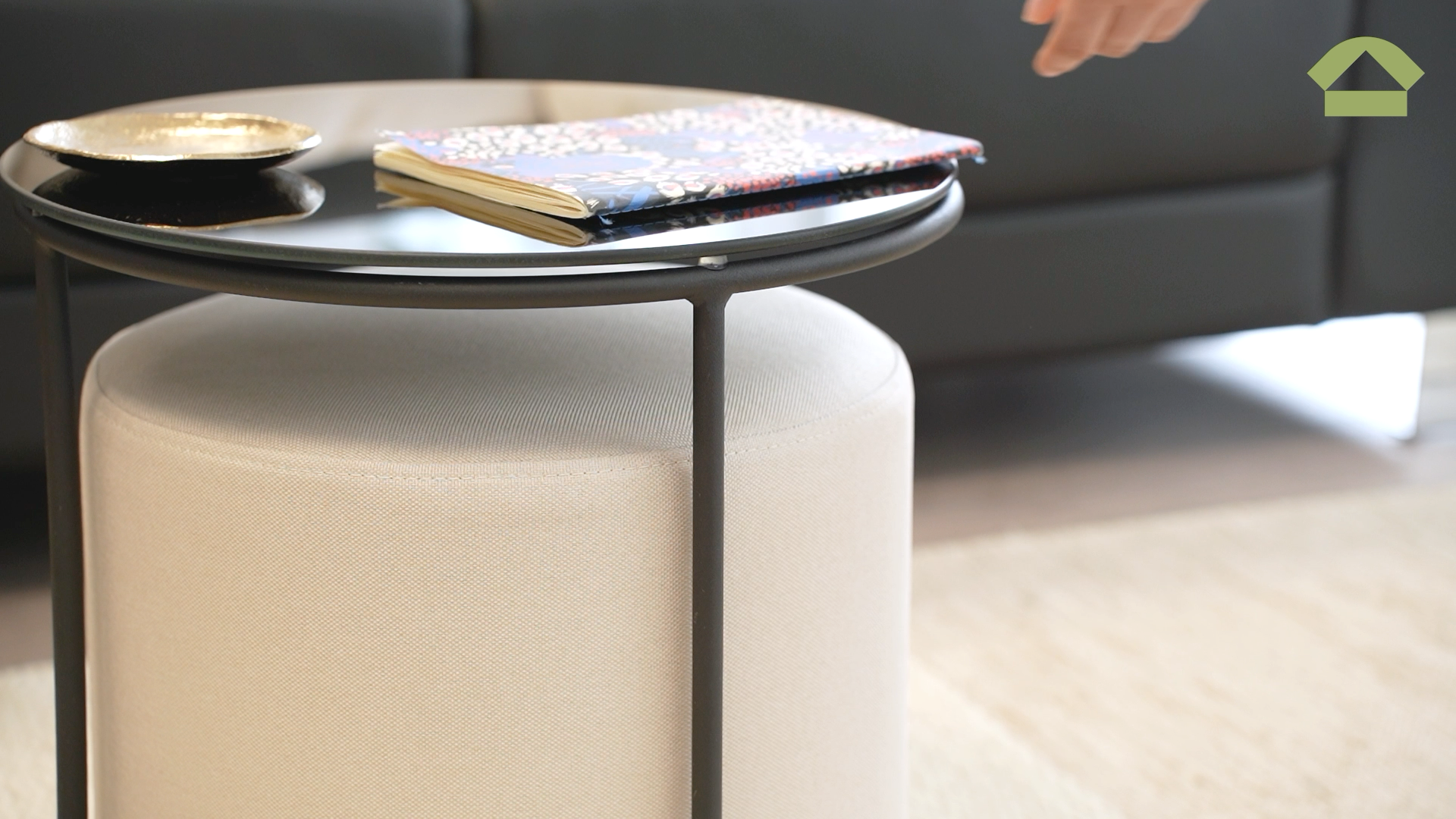 - Design multifuncional: mesa de apoio com pufe embutido.